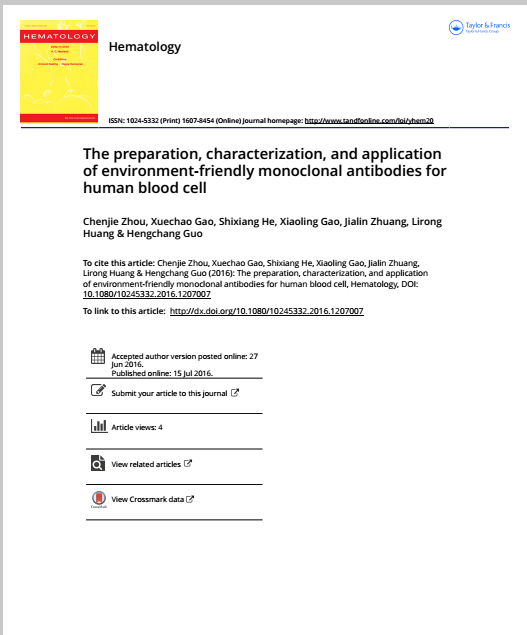 题目:《The preparation, characterization, and application of environment-friendly monoclonal antibodies for human blood cell》,在英国Hematology杂志上发表